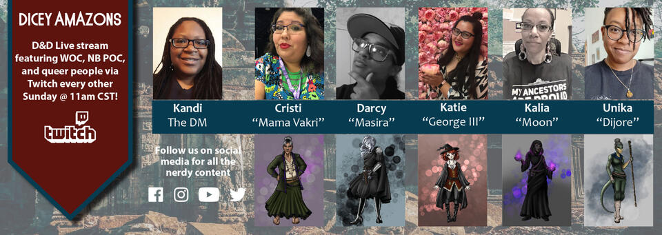 We are proud to partner with Vibrant Legends run by executive producer Leona Maple. They are a tabletop RPG one shot series that focuses on mainly indie content featuring a rotating cast of BIMPOC GMs and players. If you want to join a game you can jump into the Dicey Amazon Discord for more information or sign up for a game on the Vibrant Legends website.